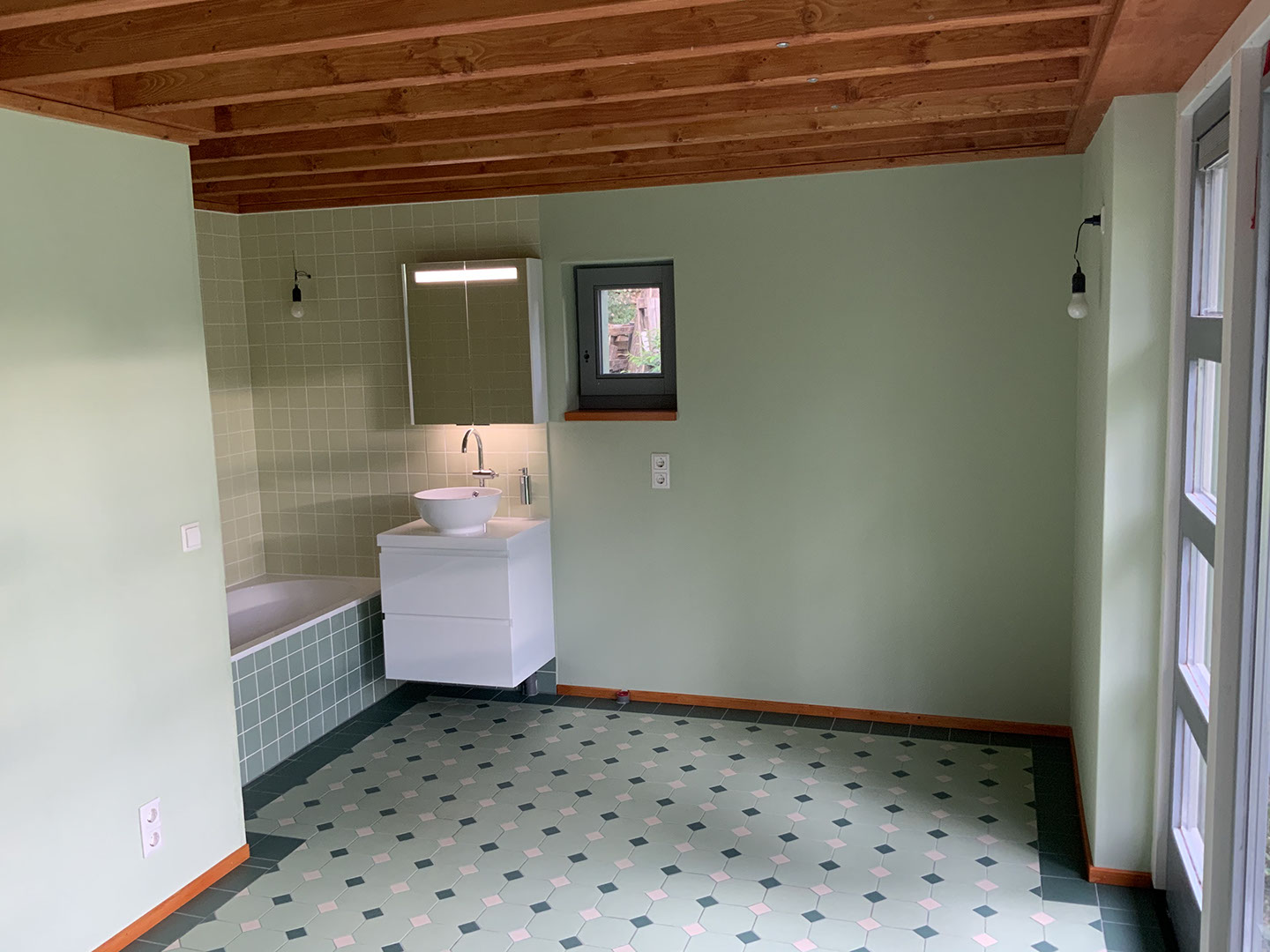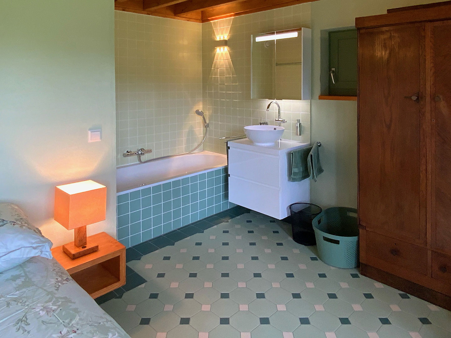 De slaapkamer met bad en betegelde vloer