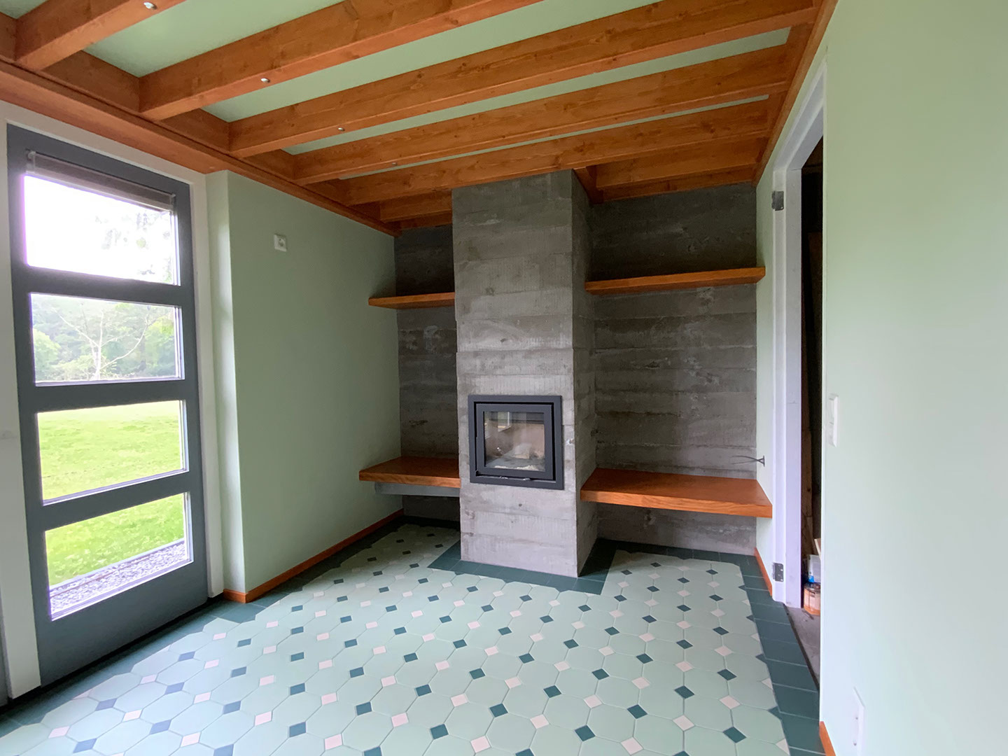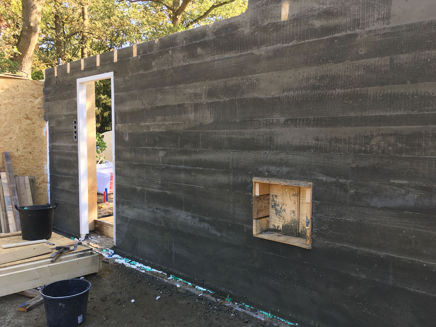 De wand met deurkozijn en uitsparing voor houtkachel is klaar