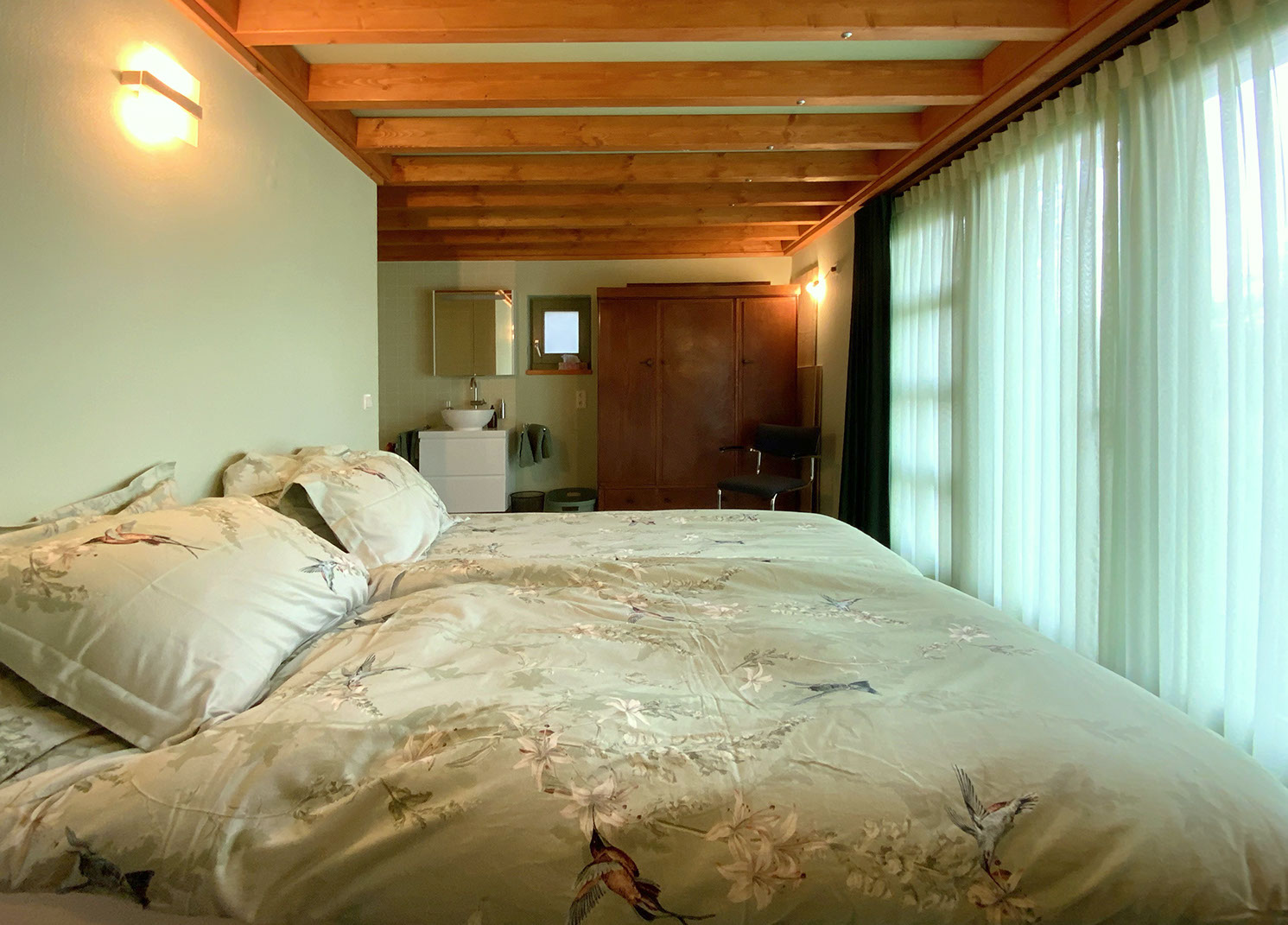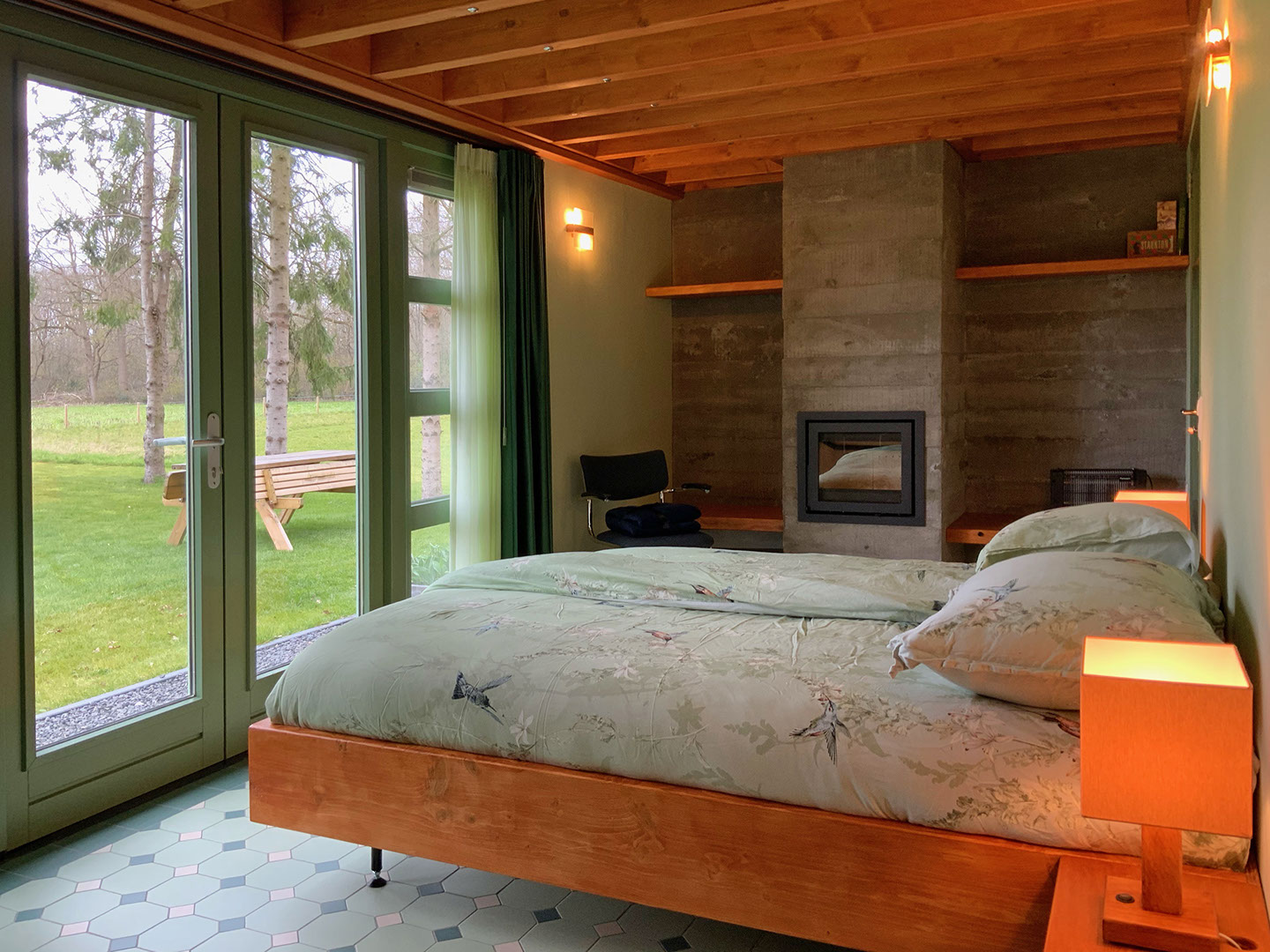 De andere kant van de slaapkamer met houtkachel