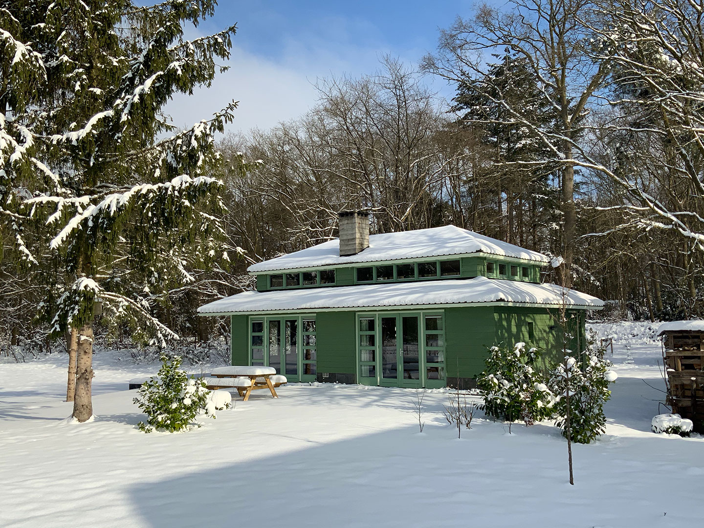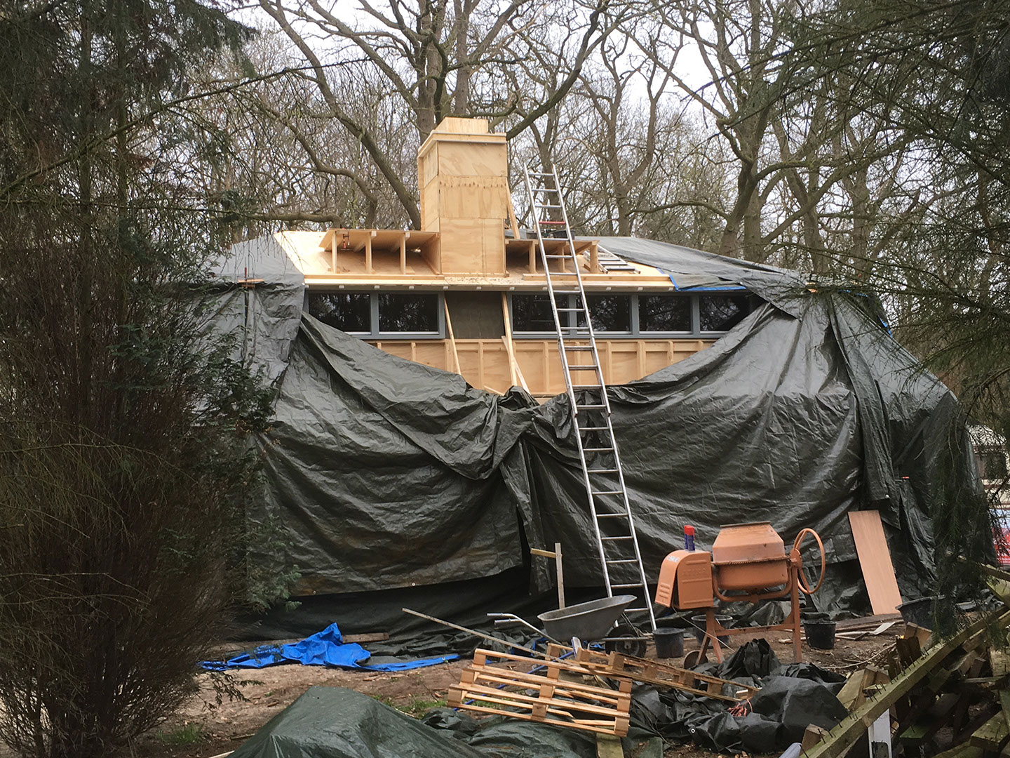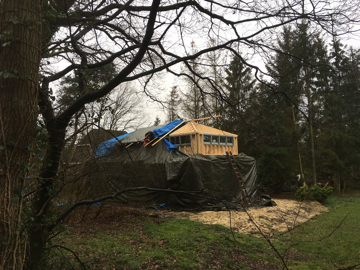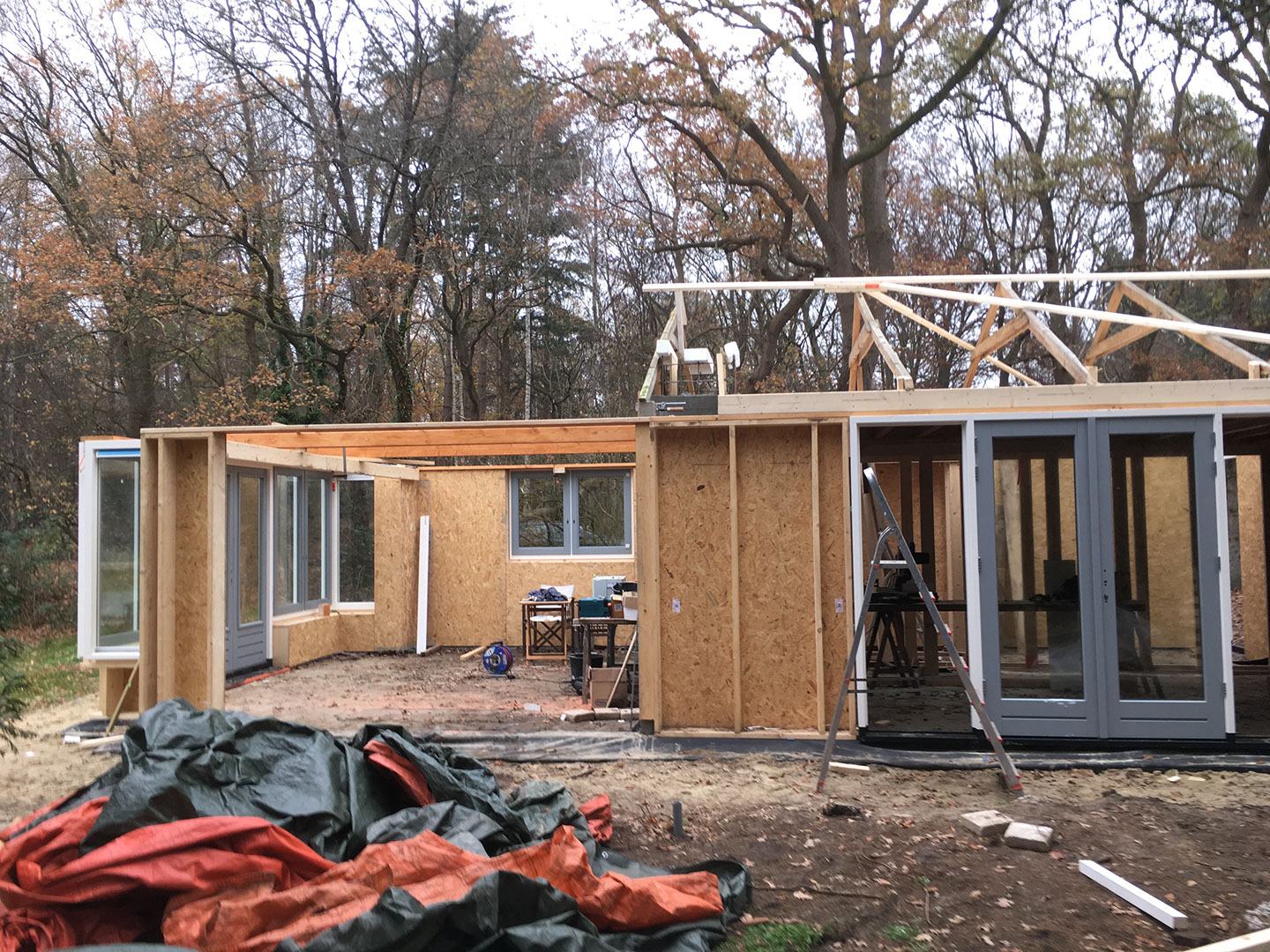 Start met plaatsen van de wanden en kozijnen en tijdelijk dak