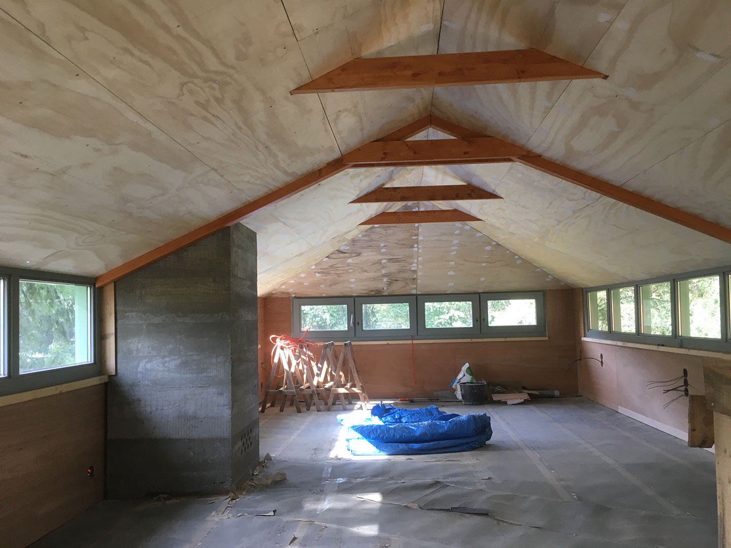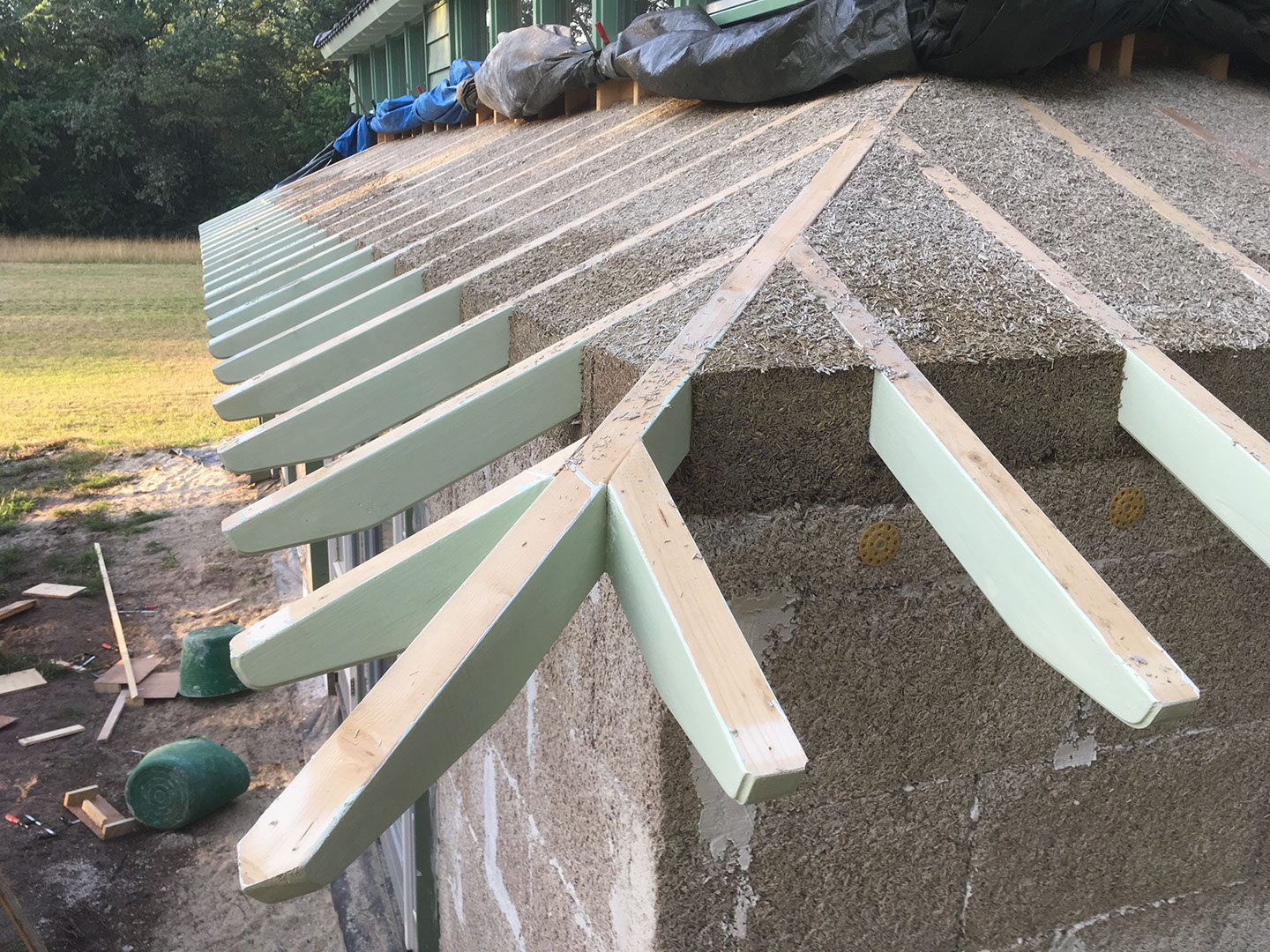 Het onderste dak is geïsoleerd met los gestorte kalkhennepmortel.