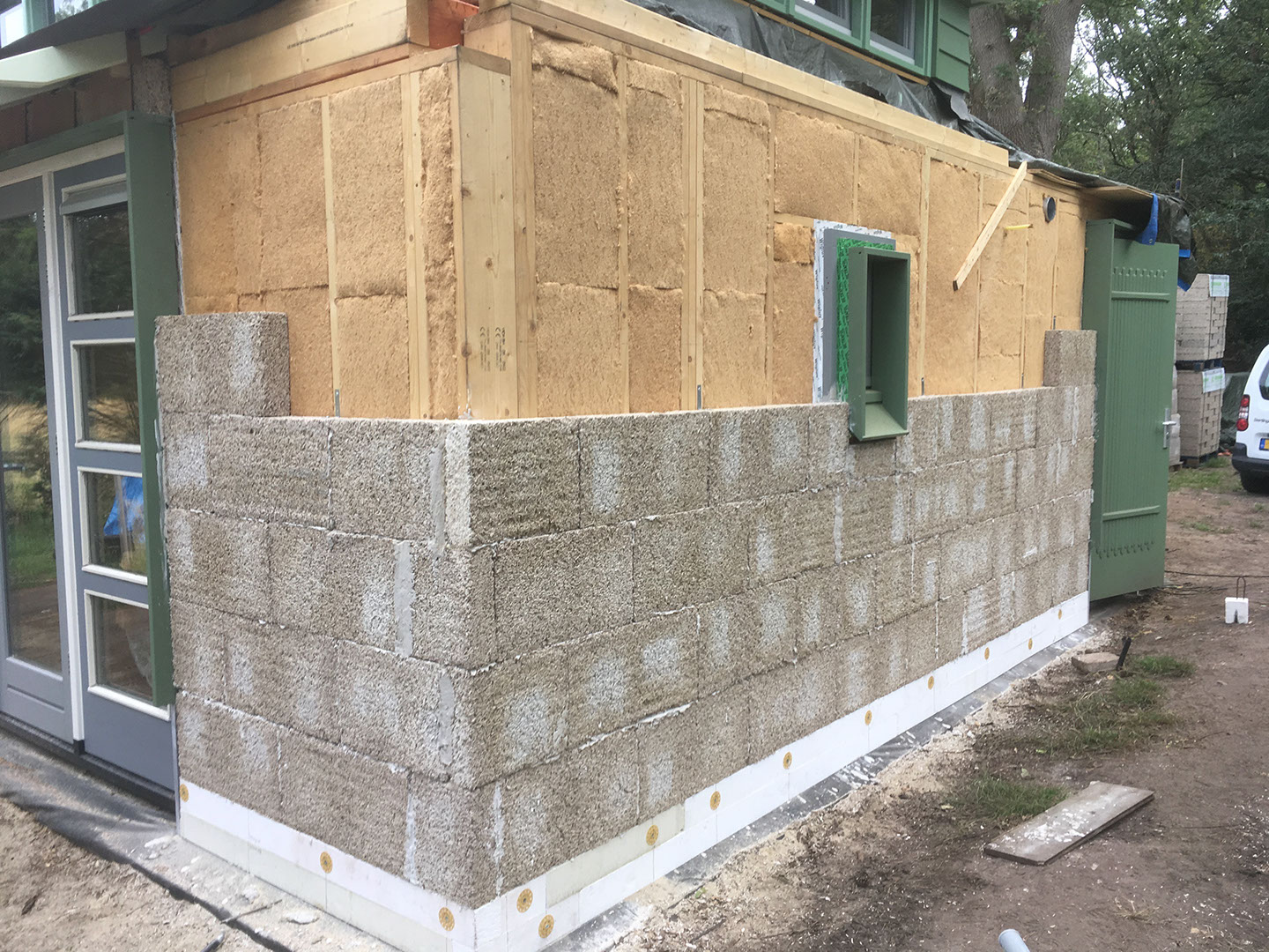 Isoleren van de buitengevels met houtvezelisolatie en daarvoor kalkhennep blokken.