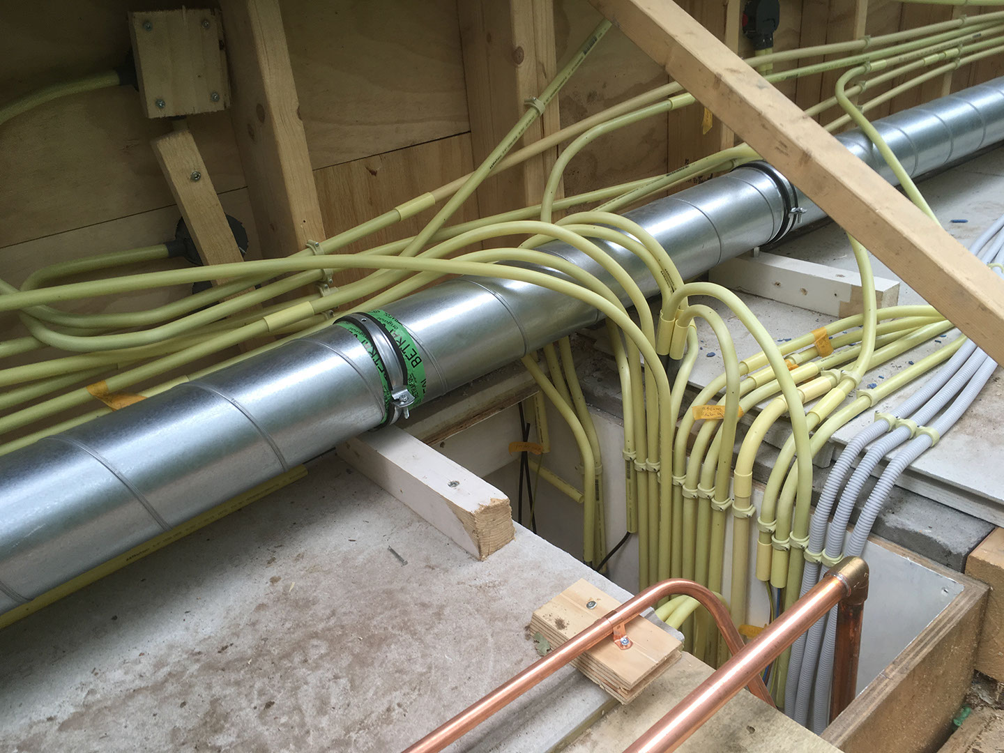 Het aanleggen van electriciteit, ventilatie en waterleidingen.
